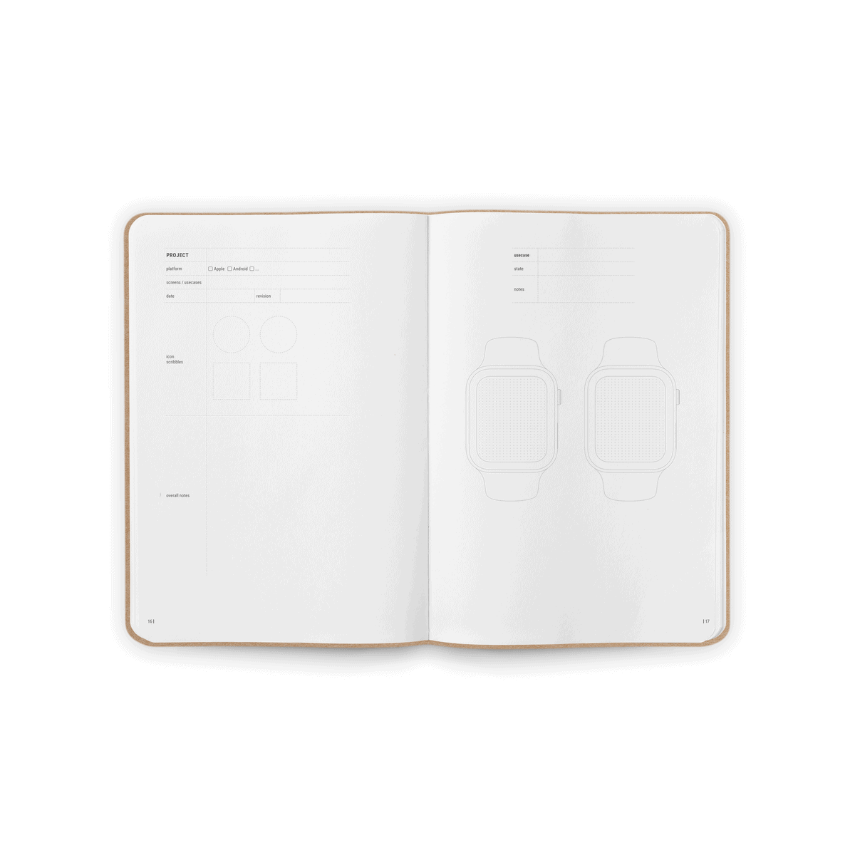Smartphone, Tablet und Smartwatch Raster mit Usecases, Thumbnail sketching und Flowcharts – alles möglich mit dem App Mockup Notizbuch.